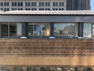 The 5th Floor of the parking garage offered the best look at Hotel Saint Louis. It showcased the new windows and light fixtures shining bright in the building along with giving hints to the interior of the rooms. The view also shows the Rooftop addition made to accommodate an outdoor swimming pool and the FORM Rooftop Bar. As you'll learn and see later, FORM is designed to replicate the original penthouse frame that sat on top of 705 Olive from 1893 to the 1950s. Another interesting change to the historic building is the removal of the arch entry way over the main entrance on Olive.
