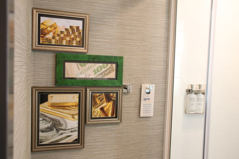 The Hotel Indigo offers 88 guest rooms with most floors having 7 rooms per floor. Floors 2 and 3 have 9 rooms per floor as the Paradowski Building has 2 rooms per floor in it. The rooms are spread out over 9 floors (Floors 2-10) and most (except for Paradowski) have bay windows. These windows let in lots of natural light and add a unique feel to the hotel room. They also feature wallpaper and pictures meant to showcase some transportation and financial history in St. Louis. In the rooms we went into, old plane propellers and rail lines were the pictures and wallpaper.