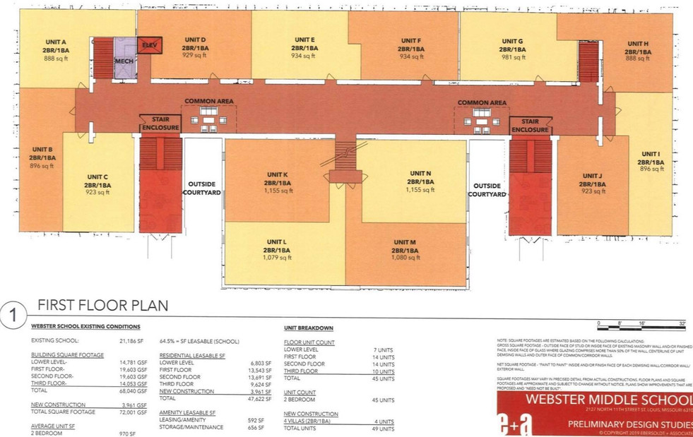 The City of St. Louis Planning Commission will review a blighting request for the property at 2127 North 11th Street at their November 13th meeting. The Webster School was designed by William Ittner and was opened in 1907 and closed in 2007. The plans call for the 68,000SF school to be converted into 45, two-bedroom apartments that average out to be 970SF. An additional 4, two-bedroom villa style units will be built on the West side of the building near Hadley Street. The total number of units in this project will be 49.